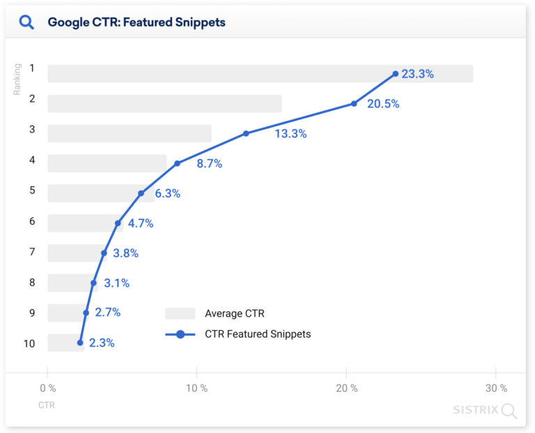 Ha viszont vannak ‘featured snippetek’ a találati listában, akkor az első helyen álló oldal kapásból 5.3%-kal az átlag alatt teljesít, így megközelíti a második helyen álló oldal az ő CTR-ét.