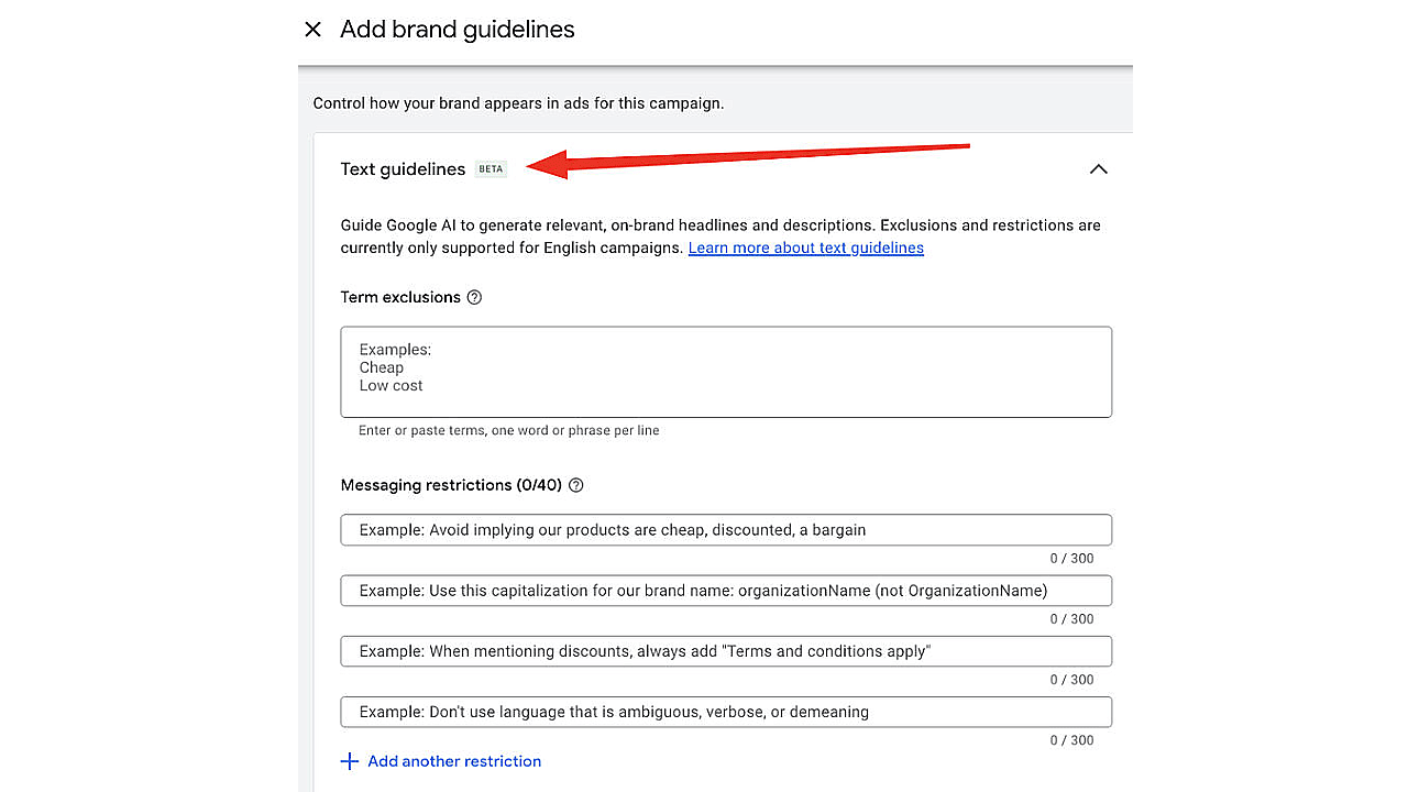 Mivel a szöveges testreszabás a kreatívokat a szándékkal párosítja, a szöveges irányelvek biztosítják, hogy azok pontosan illeszkedjenek a márkához. Mostantól meghatározhatjuk a Google AI fele, hogy milyen kifejezéseket szeretnénk kizárni vagy akár elkerülendő fogalmakat is Mindezt saját szavaiddal, olyan szabályokkal, mint például „ne sugallja, hogy termékeink olcsók” vagy „ne használjon olyan kifejezéseket, mint a »csak erre«”.